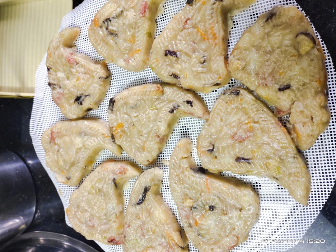 錡楠MM 做过 2024年09月04日 土豆粿:1223克土豆,8两红薯粉,红萝卜丝➕9:1瘦肥猪肉碎➕芹菜粒➕冬菇➕腊肠,适量佐料➕盐。压泥→材料炒一炒 拌匀,上模具,水开大火蒸10-12分钟。PS:可加 虾米或虾皮(炒一炒),熟花生。 2024-09-04