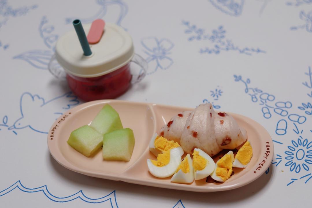 蔓越莓馒头卷,鸡蛋,蜜瓜,石榴汁