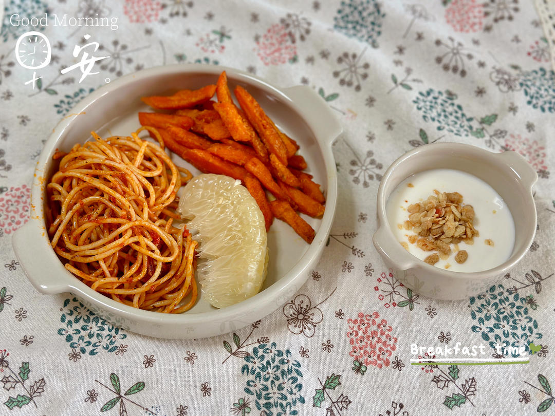 意大利面🍝+红薯条+柚子+酸奶麦片
