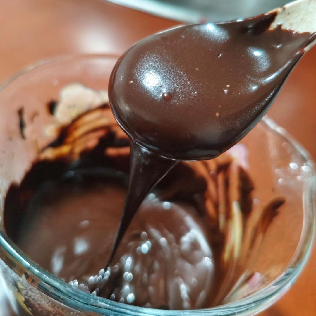 我用的玉米油,可可粉一次性加入,隔热水一直搅拌到顺滑就行(因为我后期还要过烤箱),很成功,虽然偷懒没过筛。