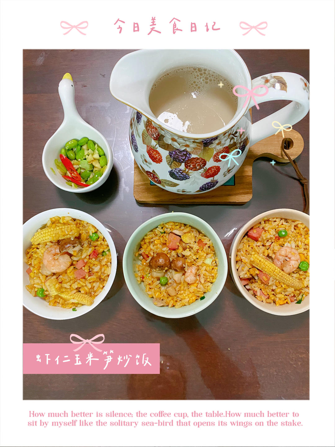 早餐品种42:虾仁玉米笋炒饭,山药燕麦豆浆。