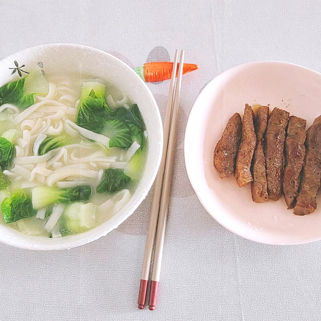 青菜煮绿豆豆丝,煎牛排