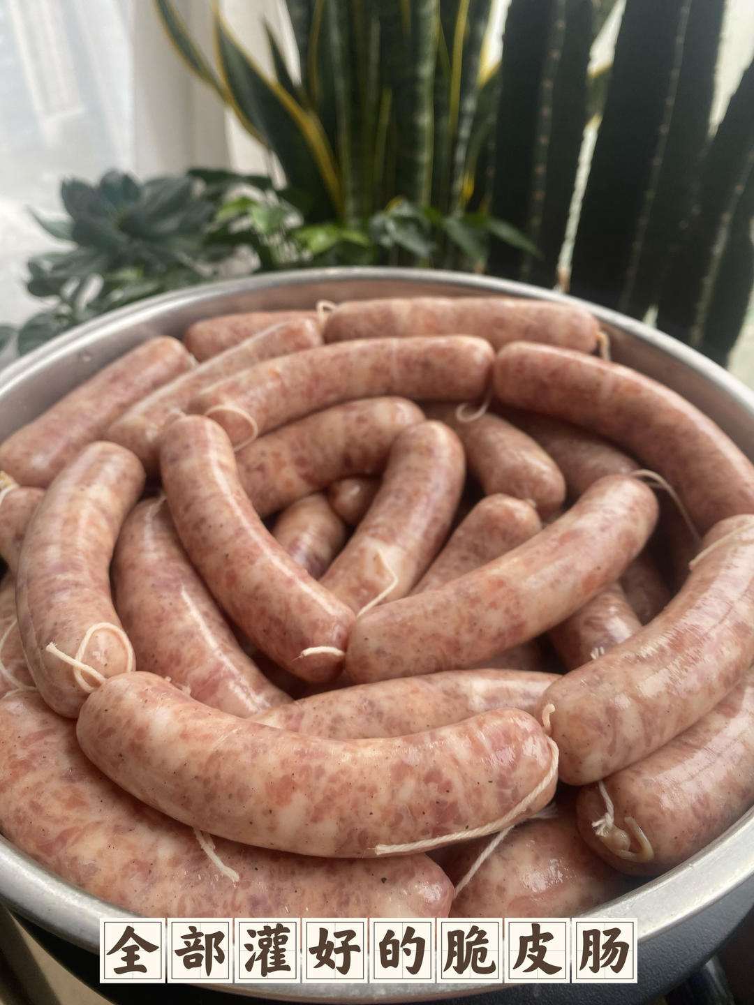脆皮肠配料:500克肉,盐10克,蚝油20克,水65克,蜂蜜20克,没放糖,黑胡椒粉2.5