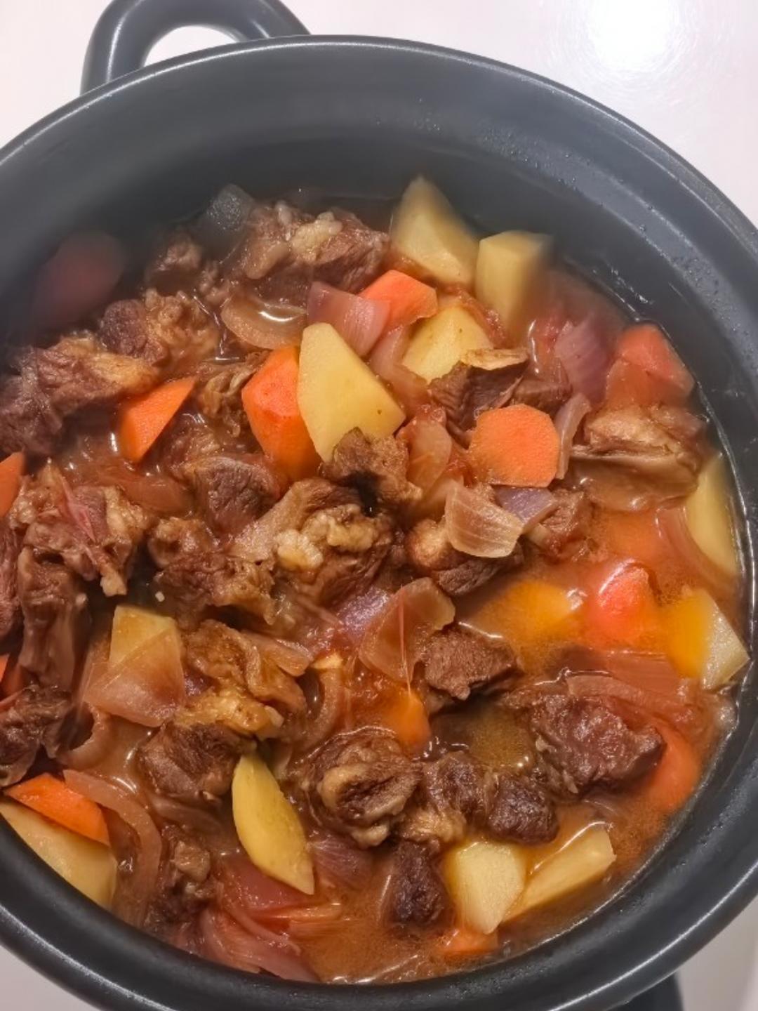 新买的牛肉,就来个番茄土豆炖牛肉吧,还有昨天的饺子煎一下