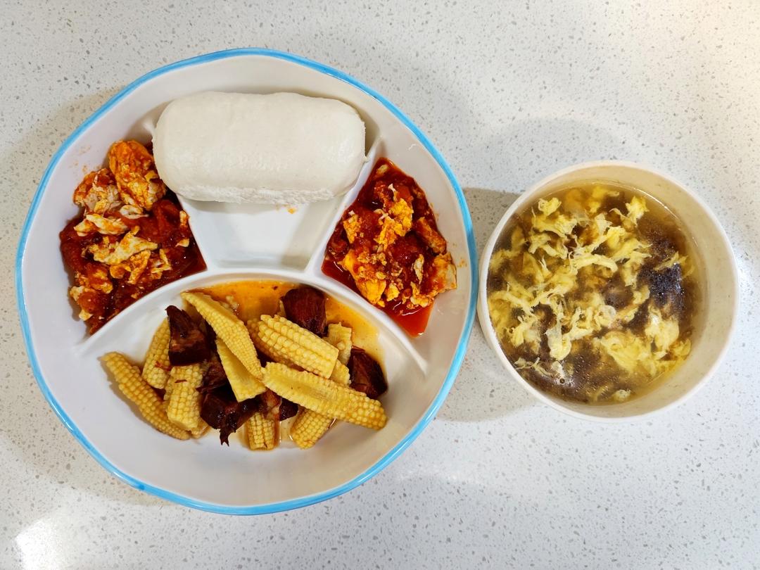 玉米笋炖红烧肉,西红柿炒鸡蛋,紫菜蛋花汤,银丝卷