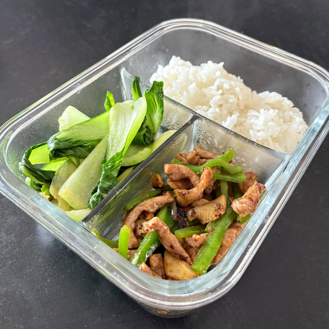 青椒肉丝 + 炒青菜 + 鲍笋排骨白萝卜汤