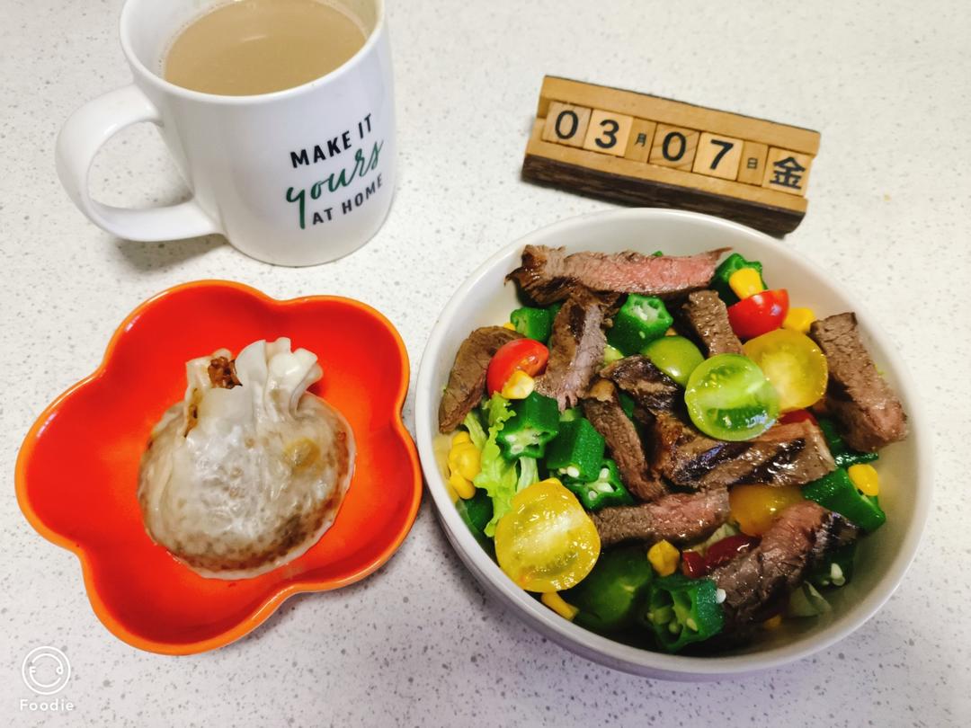 20250307早餐打卡1862:烧卖,牛排秋葵沙拉,咖啡。早餐中国;