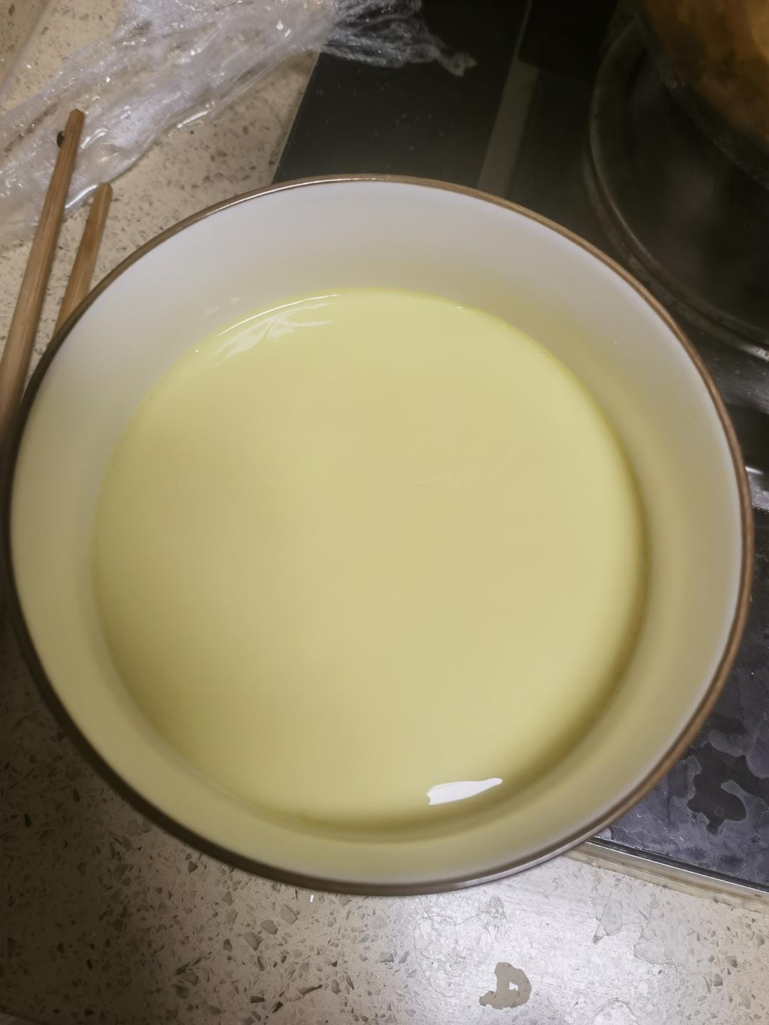 先加盐,边加温水边搅拌,没有滤网可以用勺子去除泡沫。非常成功。