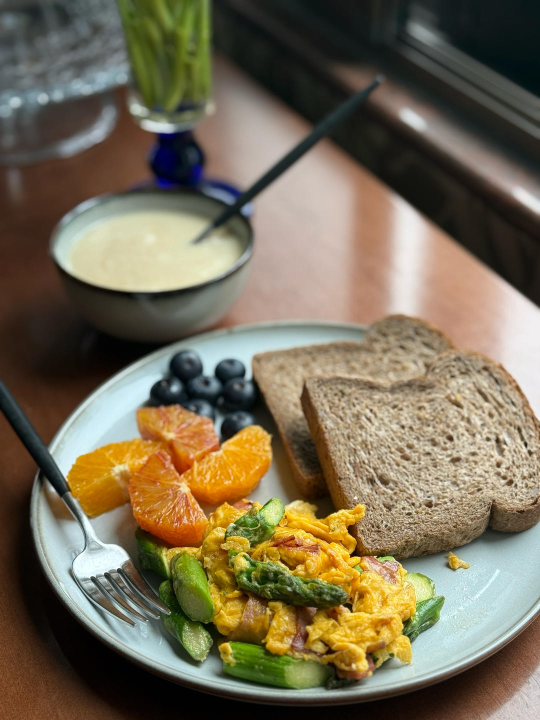 黑麦面包片,培根芦笋炒蛋,玫瑰血橙,蓝莓,土豆奶油汤。