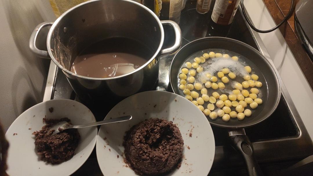 2000 years later,初步完成如图一。哦,期间莲子已煮好。回红豆水里,再次用漏勺打捞漏网之红豆皮。