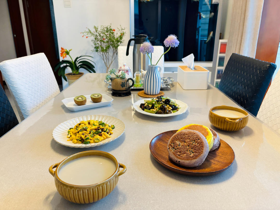 杰妈pt 做过 早餐•2025年4月21日 #早餐•2025年4月21日# 早餐:荞麦饼+玉米饼,青椒豆豉炒鸡蛋,芹菜拌黄豆木耳,猕猴桃,苹果燕麦米糊。人间烟火气,最抚凡人心。也许是通过柴米油盐,来经营自己的家庭和人生吧…… 2025-04-21