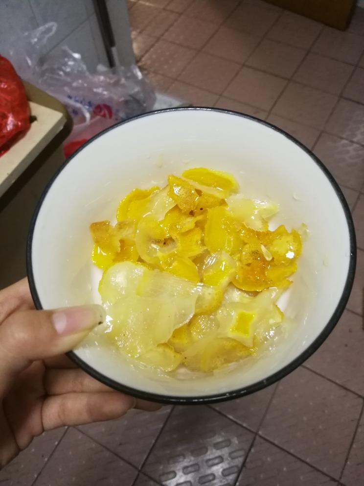 用白冰糖和黄冰糖做的,颜色有点深。但不稠。还把熬过的柠檬片拿出来了,晶莹剔透的还挺好看,泡水也好喝。