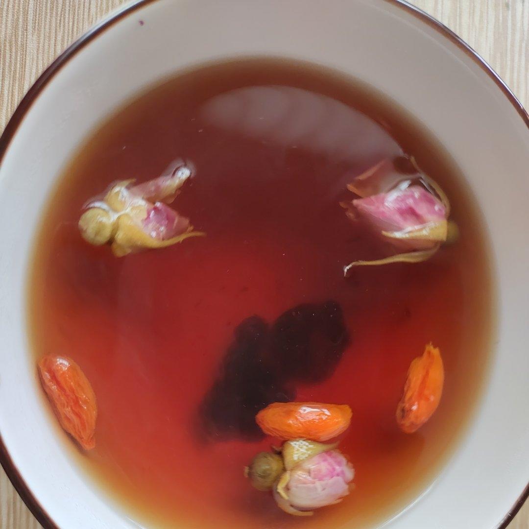玫瑰🌹枸杞桂圆,桂圆是蒸过的,加了黄冰糖,喜欢甜一点的味道,还想加醪糟来着,打住了。