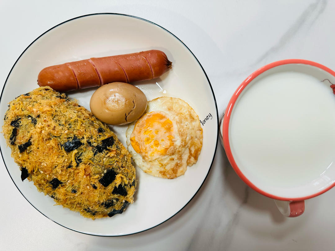 芥末籽肉松海苔面包,芝士鸡肉肠,茶叶蛋/荷包蛋