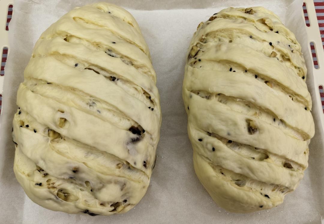 欧包,腰果核桃仁葡萄干黑芝麻,堆料满满,松软可口,420克面粉,做了两个,已经满盘了。