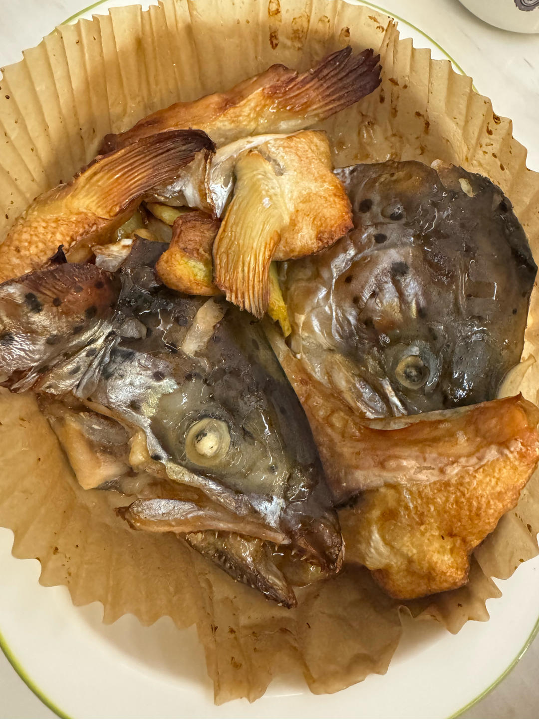 空气炸锅烤三文鱼头,先腌制(盐和蚝油),190每面10分钟,感觉可以少几分钟下次,上色有点重,