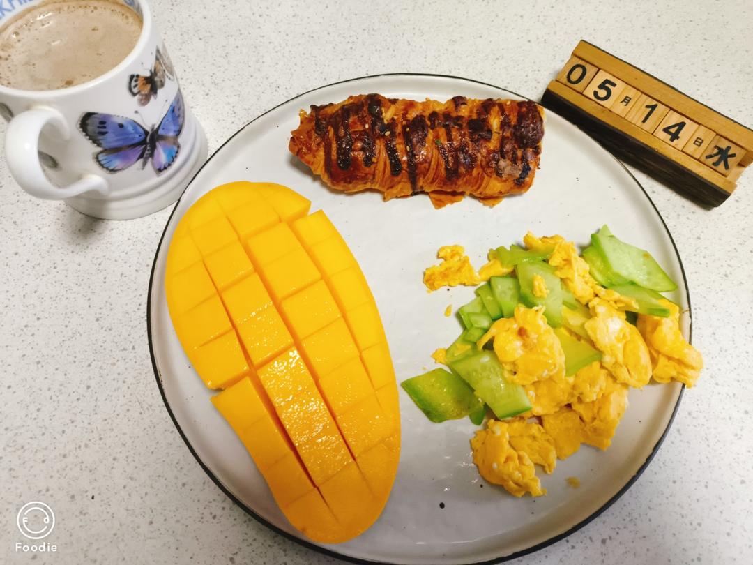 20250514早餐打卡1930:面包,黄瓜炒鸡蛋,芒果,咖啡。早餐中国;