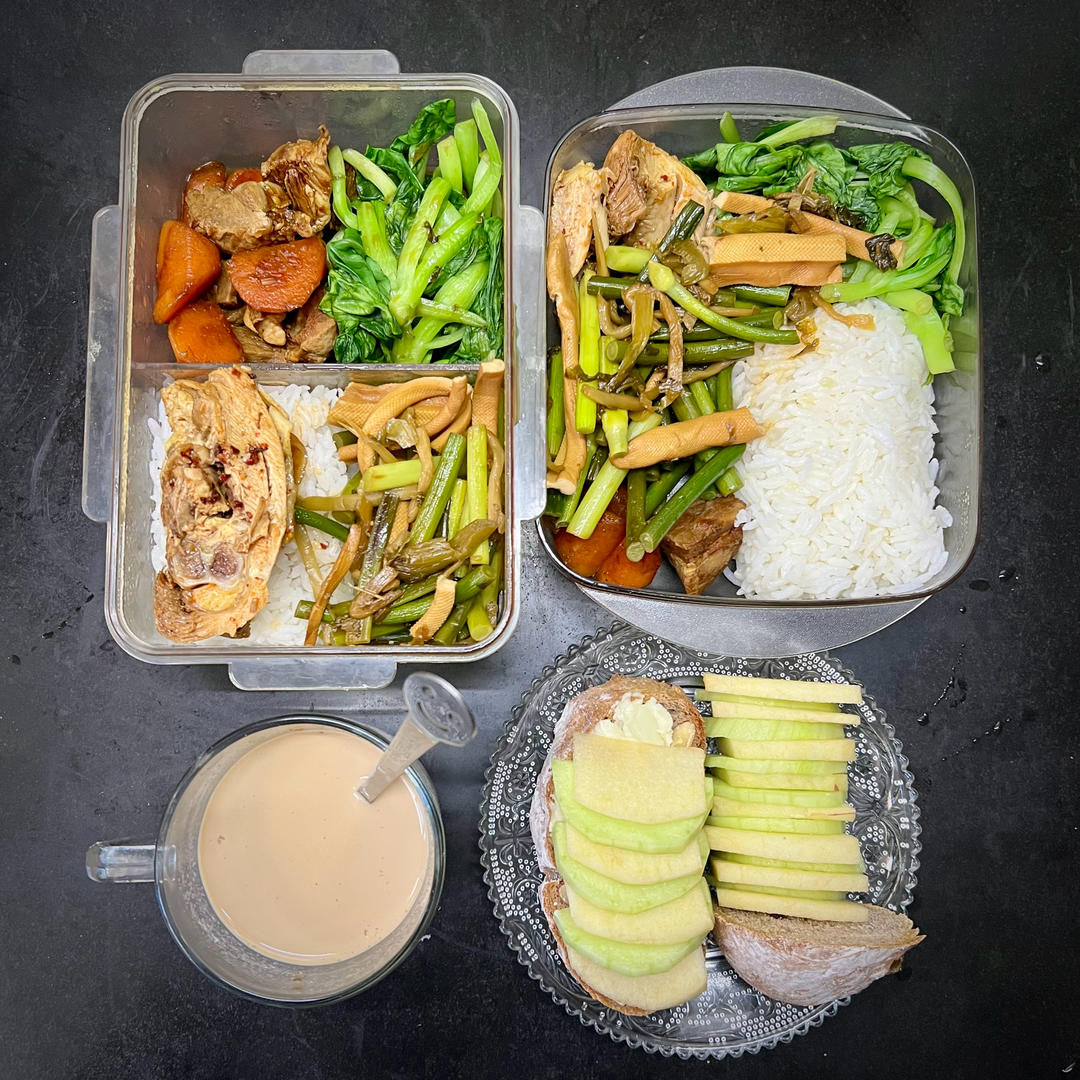 两荤两素的豪华便当!口水鸡一看就是爸爸盒马买的,确实是挺好吃的一款😋