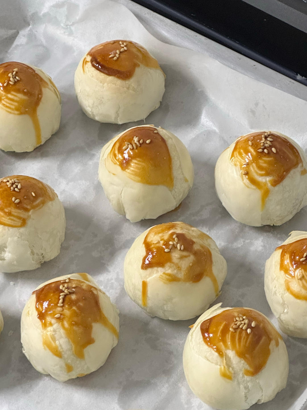 蒜头王霸霸 做过 2025年06月01日 蛋黄酥*26(豆沙*13+豆沙肉松*13)依旧是烫面法✌️这次换了顺南的金装低糖豆沙 比广酒的甜度低 没这么油 延展性稍微差点端午节上了一天班 晚上极限3个多小时搞完😴-油皮21g|油酥12g|豆沙20g 2025-06-01