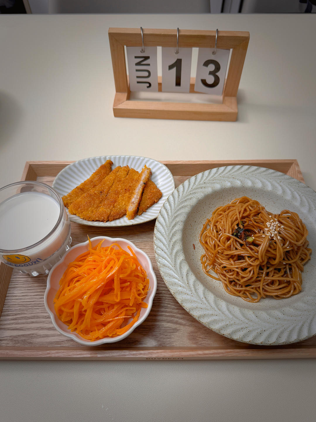 葱油面|空气炸锅炸猪排|炒胡萝卜丝|牛奶