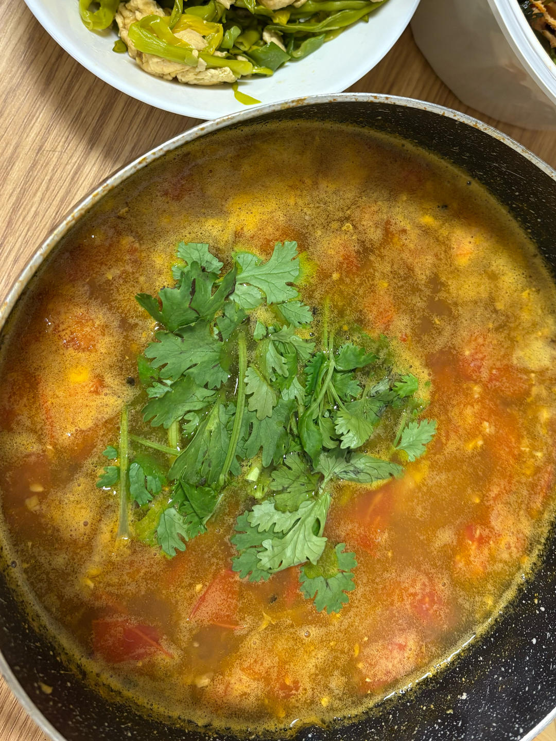 因为百香果放多了点觉得有点酸,就多加了点水。汤很香还能煮别的。牛肉真的很配,同时腌了点鸡肉明显没有牛肉好吃。香菜也很配,味道没那么单一了更有层次。