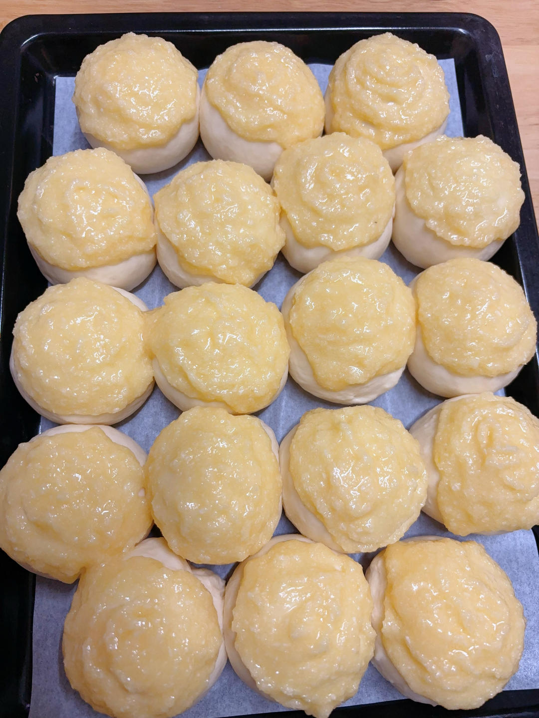 直接用了一整包500g的高筋粉,鸡蛋一个(去壳50g左右),糖40g,盐5g,耐高糖酵母5g,黄油45g,牛奶280g,全程手揉出膜(20分钟左右),最终生胚50g一个,做了18个。