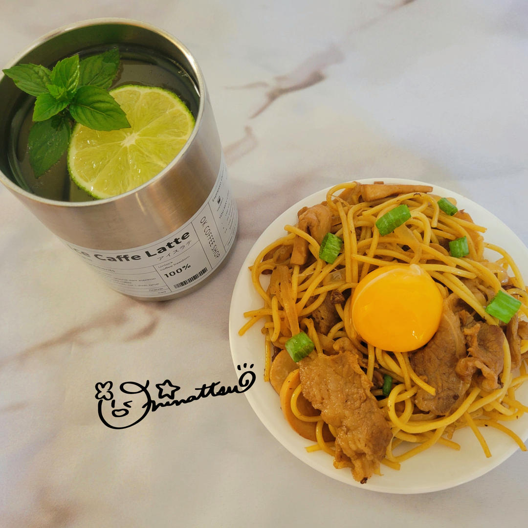 今天端上来的是——寿喜烧意面+ 青柠薄荷汽水,一口热情一口清醒,吃着吃着我都怀疑自己是不是在拍美食番!