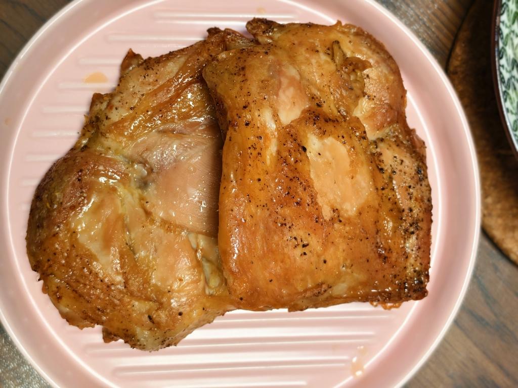 盐和黑胡椒碎,也可以再加点一些香草,用的拆骨鸡腿,烤箱烤了40分钟,吃的时候又用空炸200度10分钟,皮脆脆的,好好吃