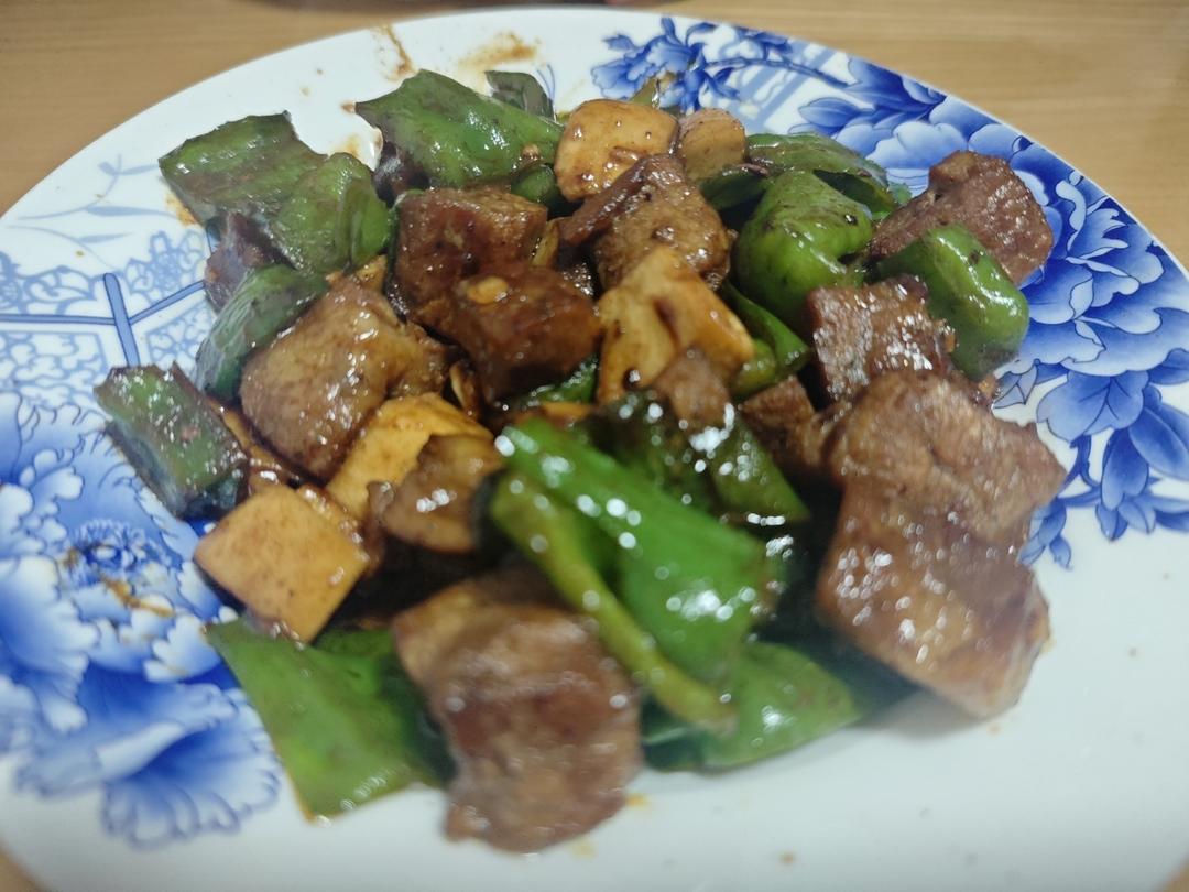 牛肉粒300g,杏鲍菇1根,青椒2个