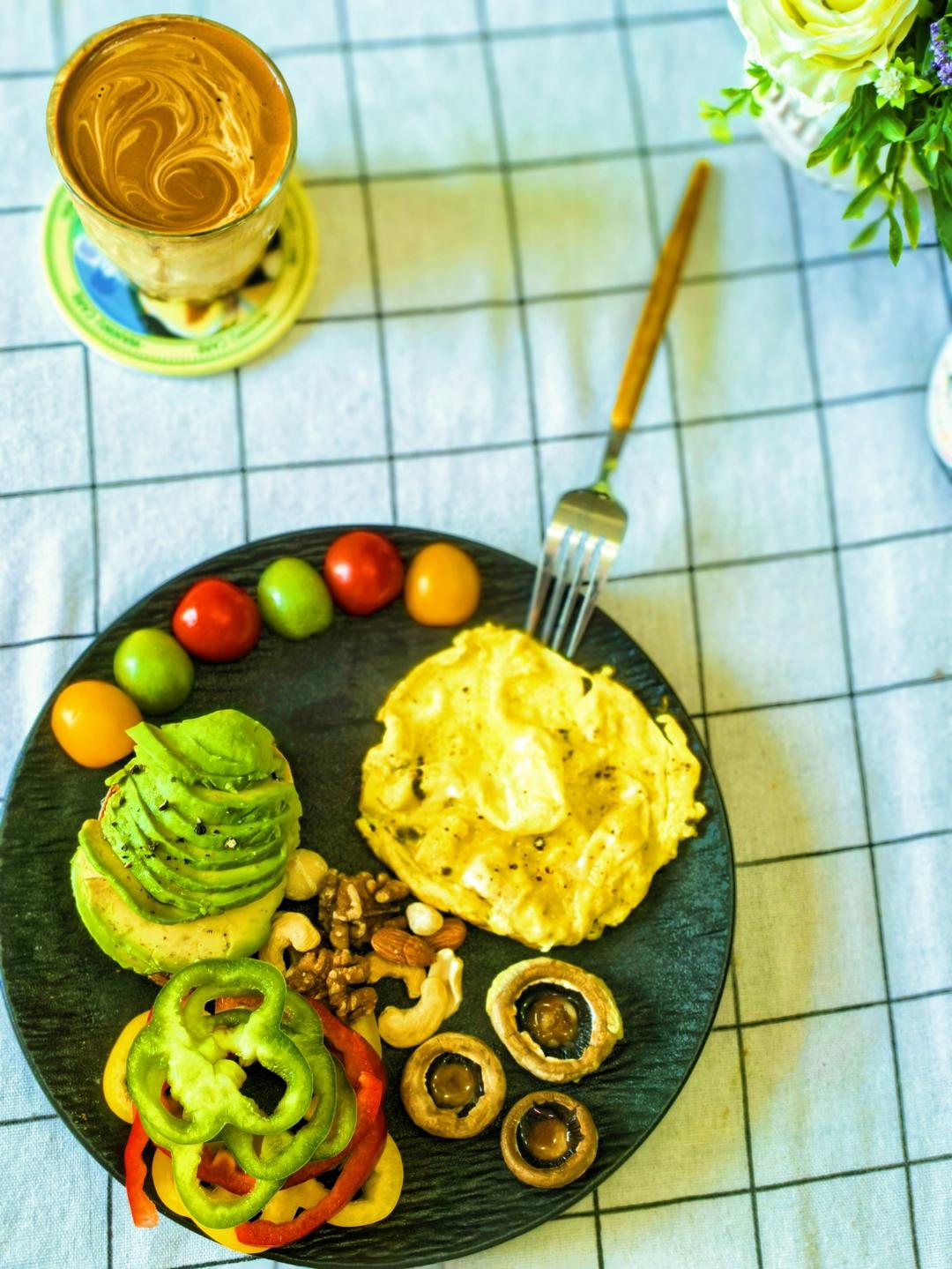 一个牛油果开放式三明治,一个嫩滑蛋,煎个口蘑,再加几片彩椒+几粒小番茄,饮品打一杯拿铁,配几粒坚果,最后再来一片女人补养气血、养颜的阿胶糕,超级完美的原材料早餐。 #早餐•2025年9月7日#