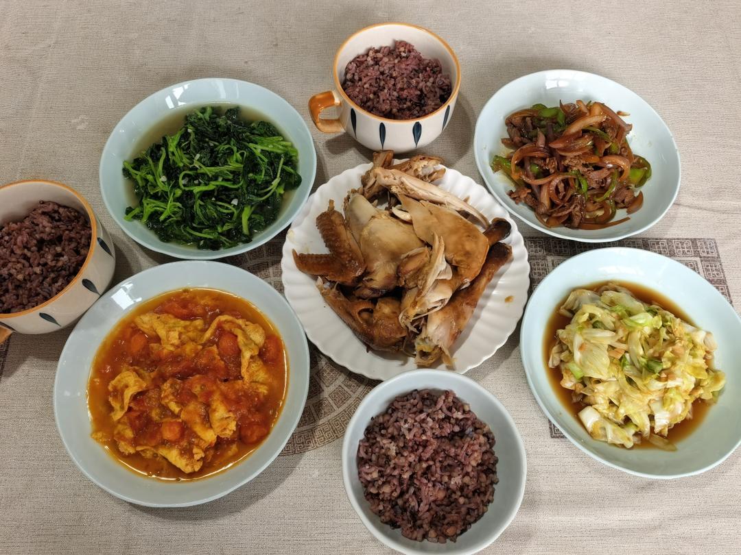 酱油童子鸡,青椒洋葱牛肉丝,清炒牛心菜,清炒米苋,番茄炒蛋,杂粮饭
