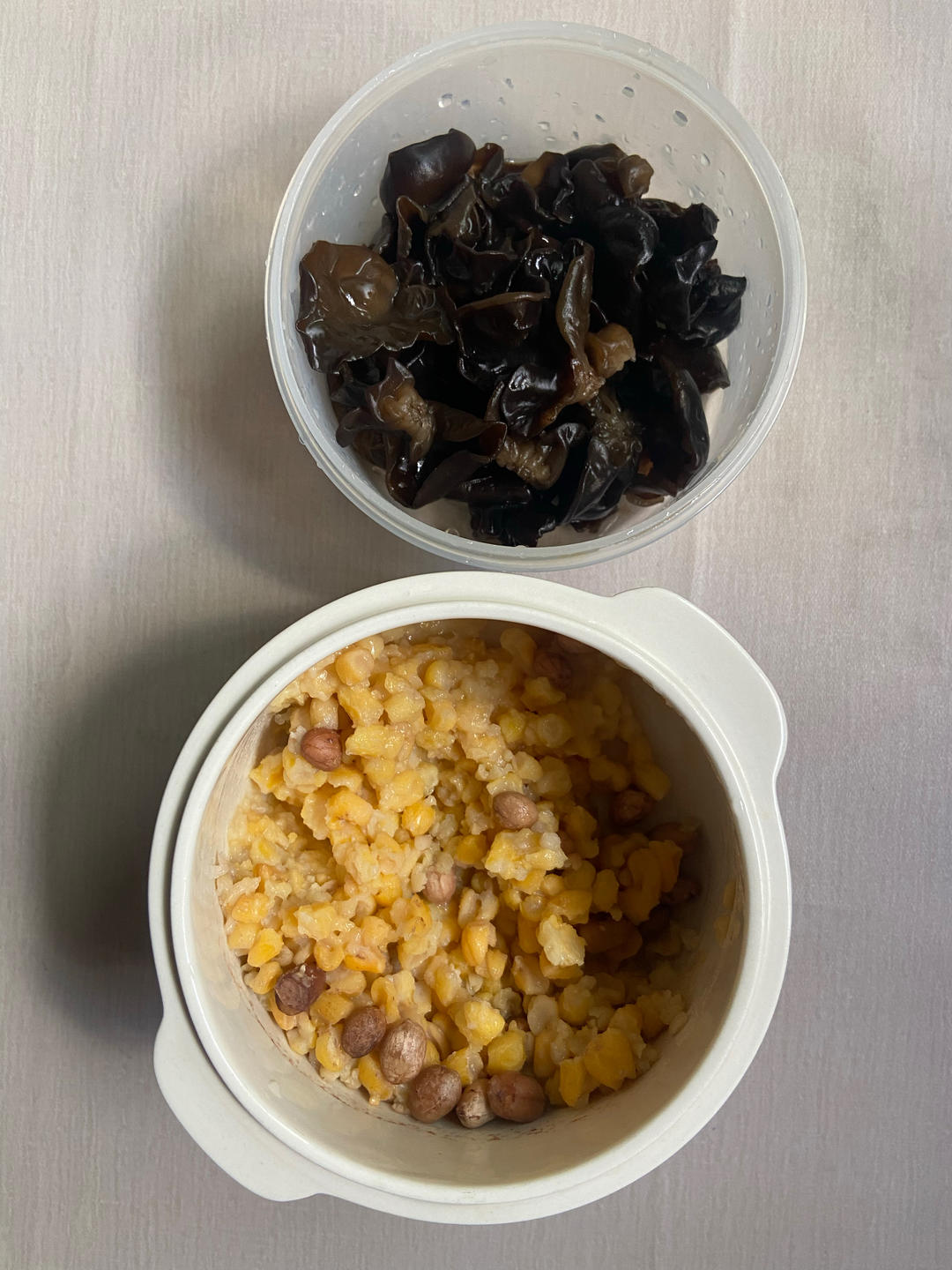 玉米粒+ 花生仁+ 脱皮绿豆; 煮木耳