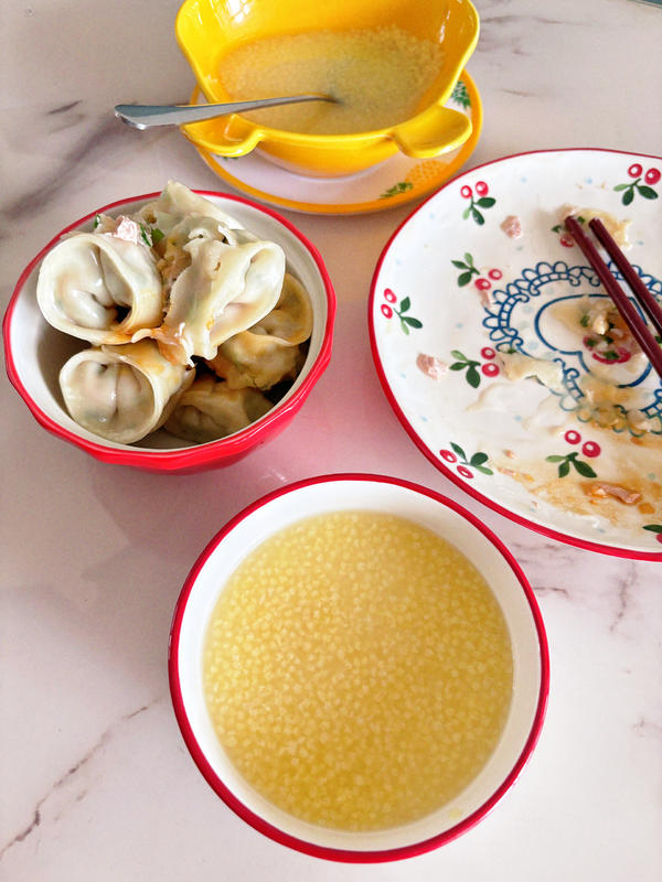 姐姐洗完脸过来说的第一句话却是:我的小米粥呢? 没错,姐姐吃韭菜猪肉饺子要配小米粥吃才行。