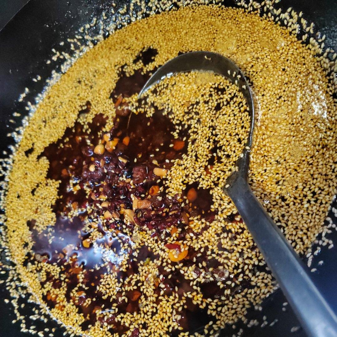 熬夜学习,方子挺好的,我放的肉和花生比较多,芝麻放晚了,辣椒碎打的有点小,炸的有点干了,不过味道很赞,自夸一下😅