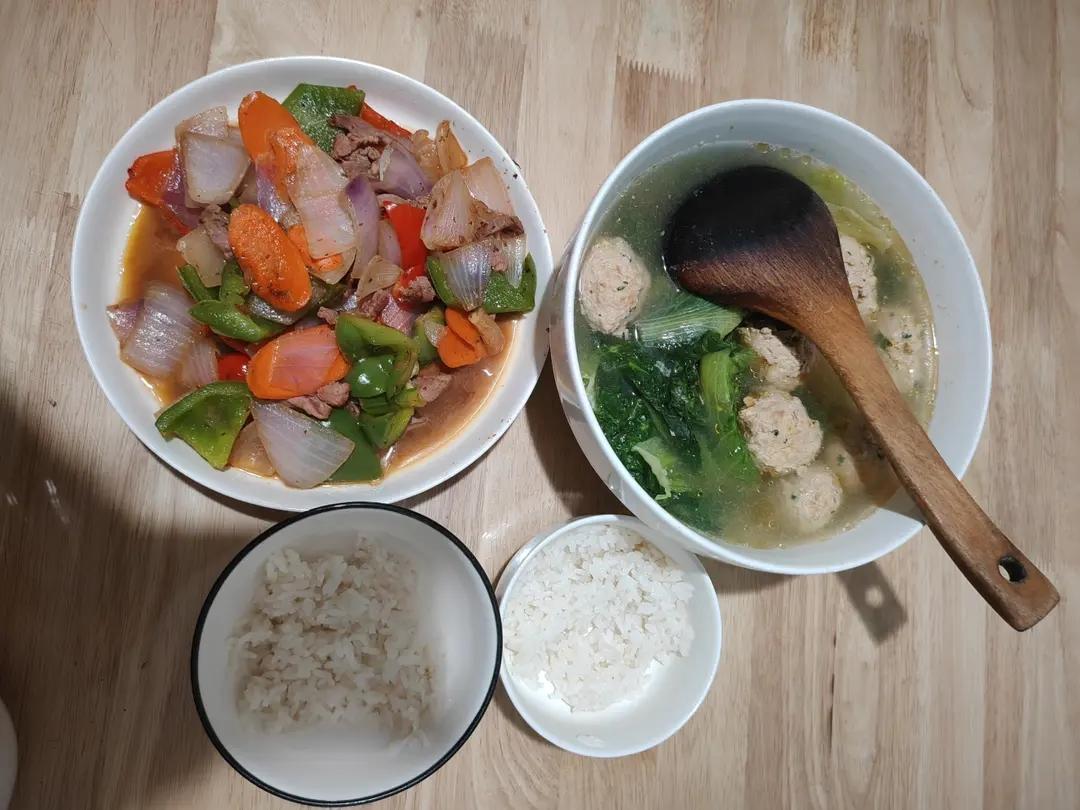 9.29 简单晚餐生菜肉圆汤~青红椒洋葱胡萝卜炒肉丝