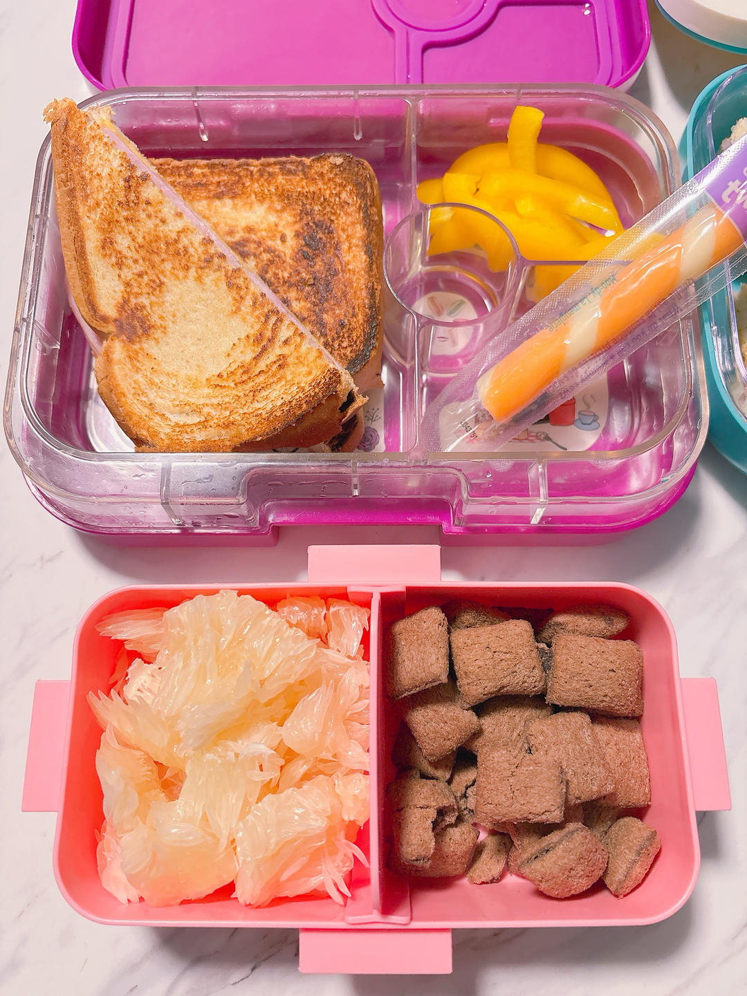 今天吃啥米 做过 mommy's cook #mommy's cook#Day21 ham sandwich+pepper+cheese & pomelo+chocolate bites #Nana's lunch box# 3天前