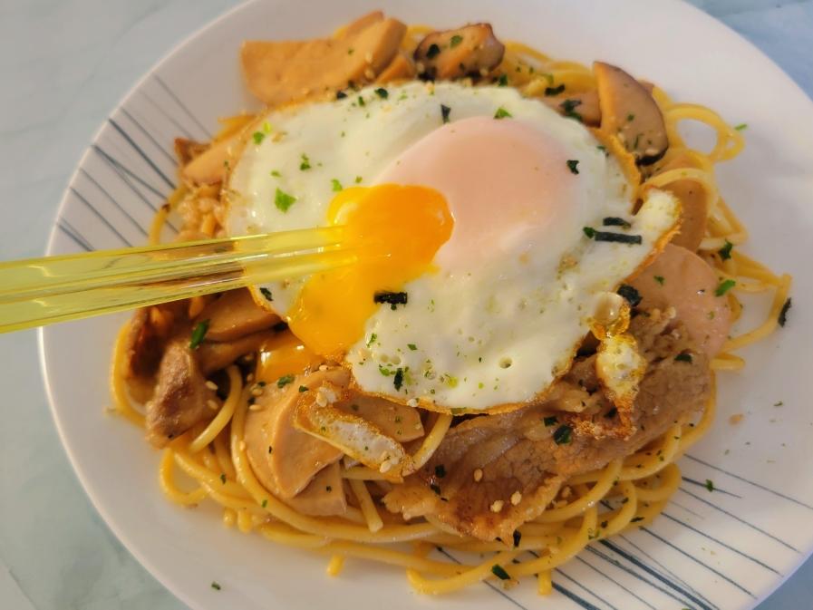 寿喜烧汁不像意面传统的番茄红酱那样高声喧哗,也不似罗勒青酱的浓烈挑逗——那是一种沉稳的咸甜交错,酱油的深色如墨,裹着味淋的酒香和糖的微甜,在舌尖轻声细语地开场。大葱的辛香在脂膏的高温中被转化为近乎甜美的温柔,与肥牛的醇厚并肩而立,相得益彰