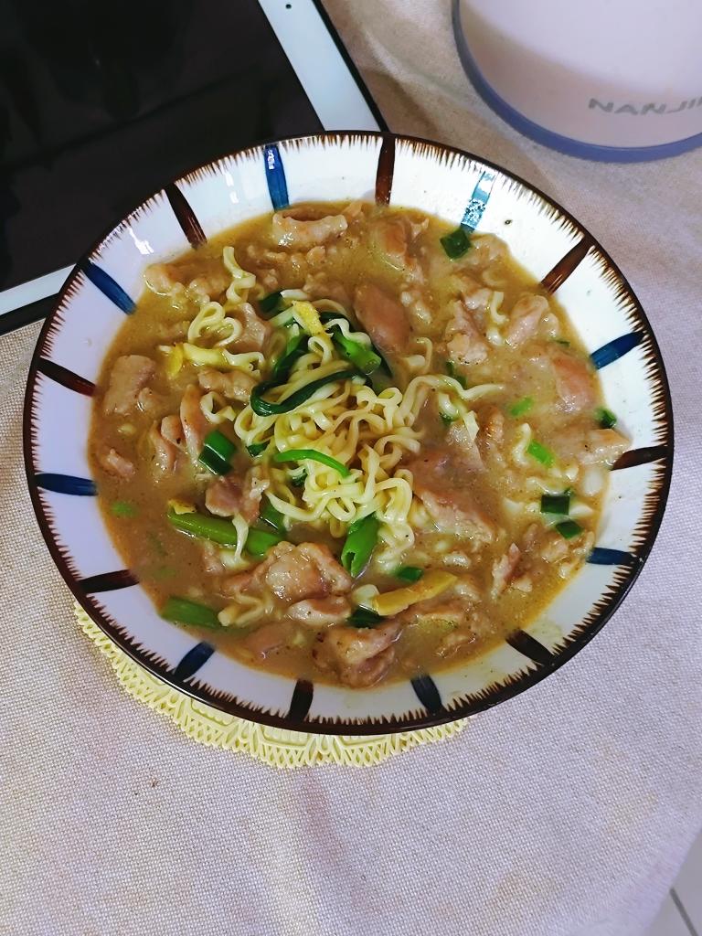 瘦肉沙茶面,好吃!一大勺沙茶酱煮汤,关火前加半盒纯牛奶,汤就顺滑了