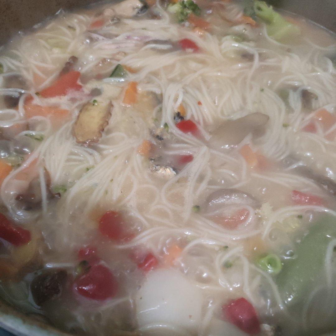加了蔬菜的海鲜面,用姜片和蘑菇熬的汤。