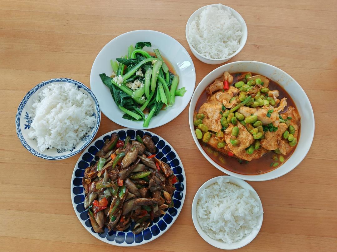 今日午餐:鱼块烧豆腐,红烧茄子,广东菜心。