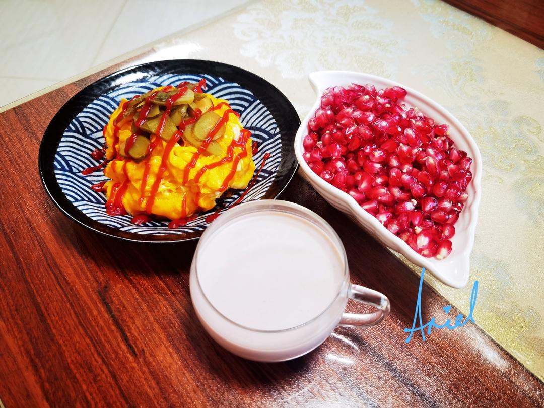 芝士滑蛋盖浇饭🍛、阿华田牛奶🥛、石榴