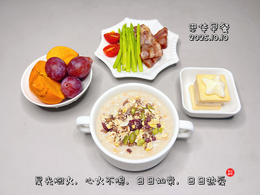 森_f3py 做过 早餐•2025年10月10日 #早餐•2025年10月10日# 山药豆浆燕麦粥撒满坚果与果干;栗子芝士西点的绵密香甜;芦笋培根的咸香清脆点缀番茄红晕。佐以柿子的澄甜、西梅的微酸,恰是晨光里最生动的滋味。 4天前
