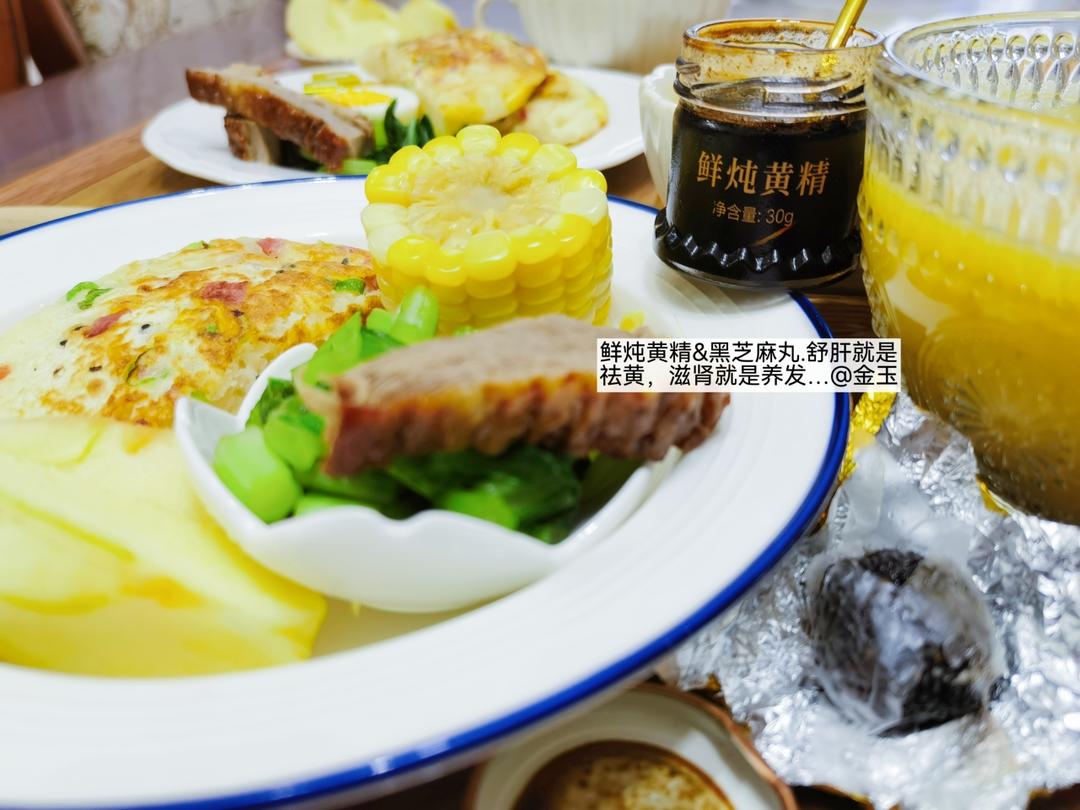 今天的早餐:鲜炖黄精/黑芝麻丸➕太阳蛋饼/烧鹅菜心/煮蛋奶酪➕南瓜坚果米糊➕花牛苹果