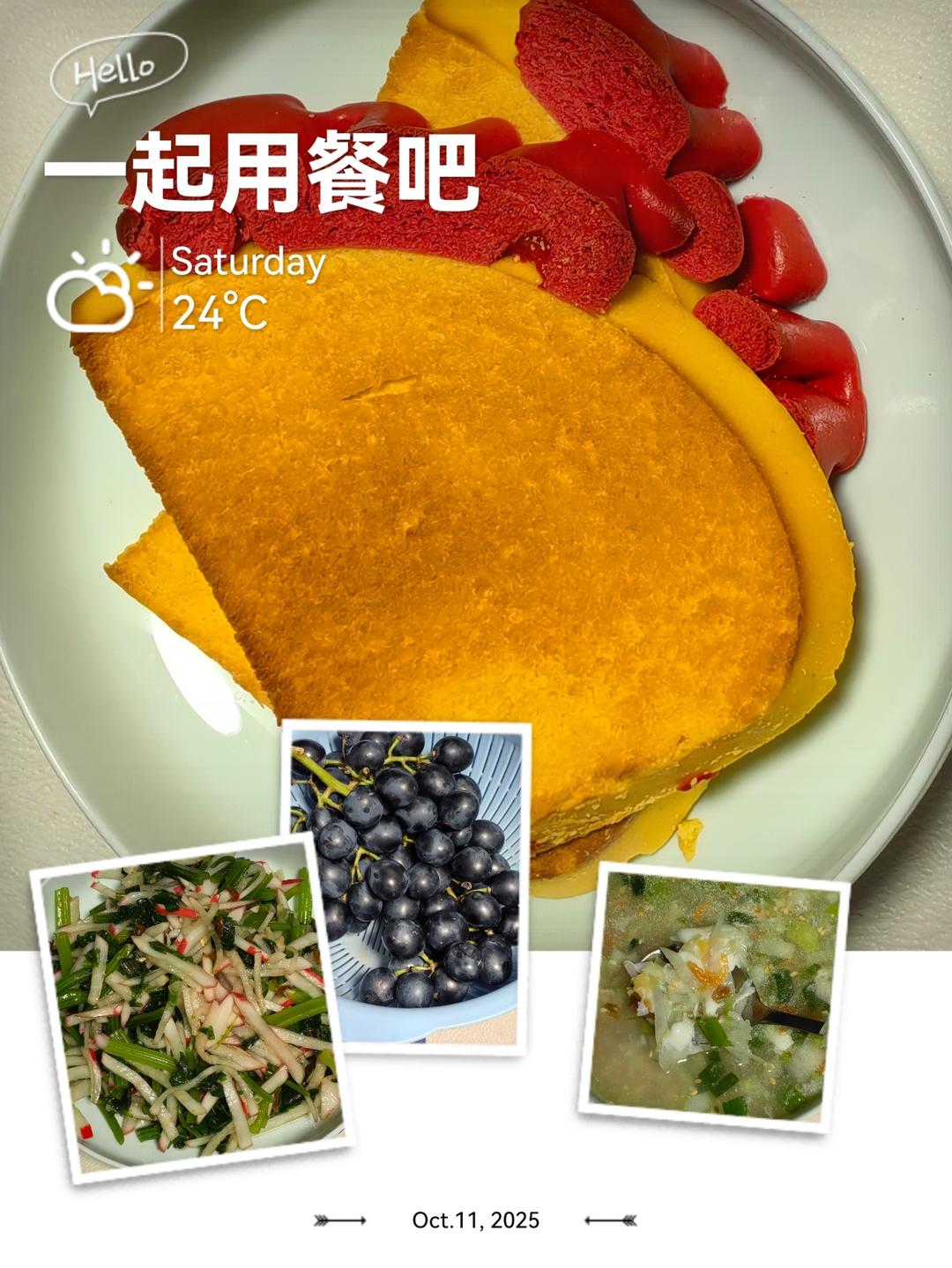 一起用餐吧—烤馍片、凉拌萝卜丝芹菜、萝卜丝汤、巨峰葡萄