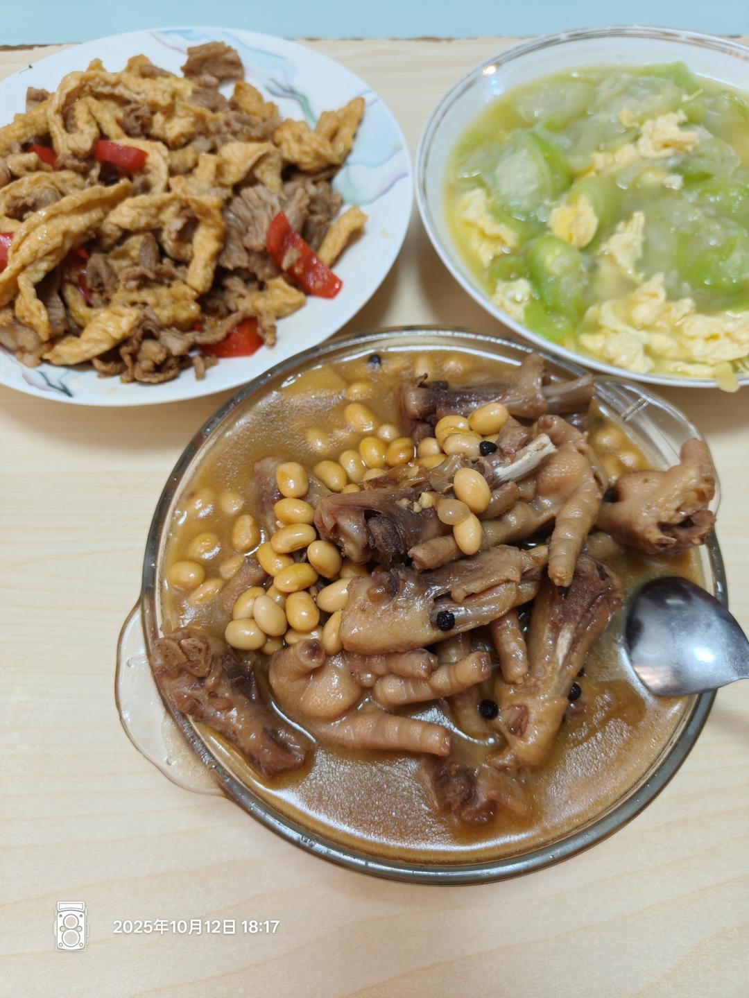 黄豆焖鸡脚,丝瓜炒蛋,豆条炒肉