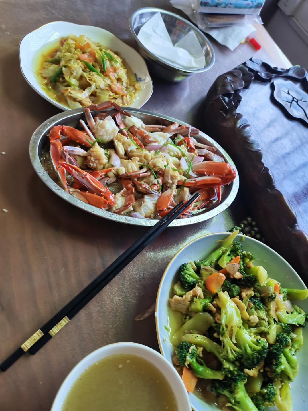 螃蟹🦀粉丝 西蓝花炒鸡胸肉 包菜 筒骨汤🤣