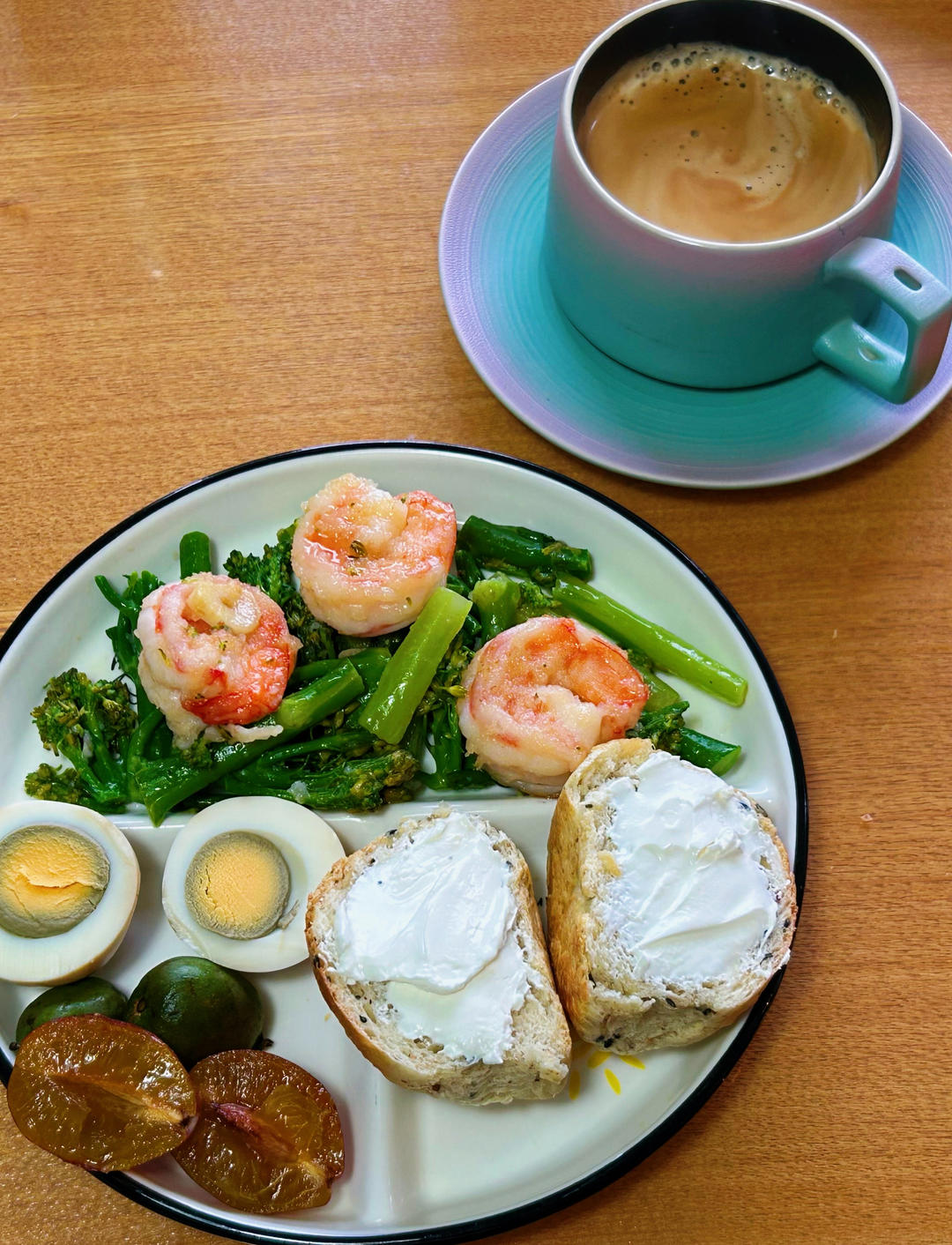 甜杆西兰花炒虾仁,无糖小面包,涂抹奶酪,茶蛋,李子,圆枣子,咖啡
