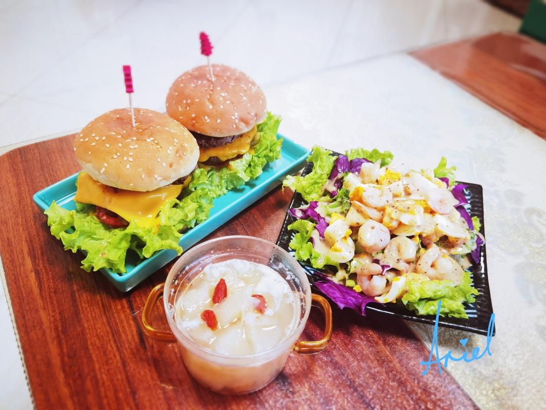 芝士和牛双层堡🍔、虾仁蔬菜沙拉🥗、银耳百合炖梨🍵