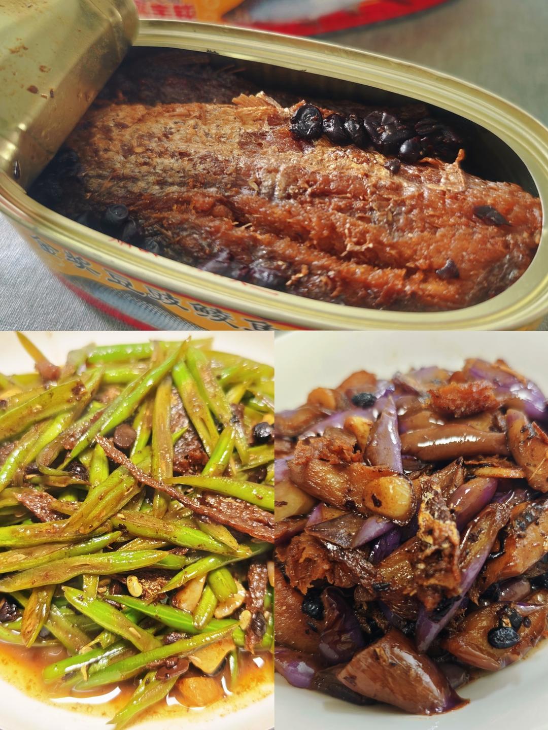 一个鲮鱼罐头三个菜,鲮鱼炒茄子🍆,鲮鱼炒豆角🍚