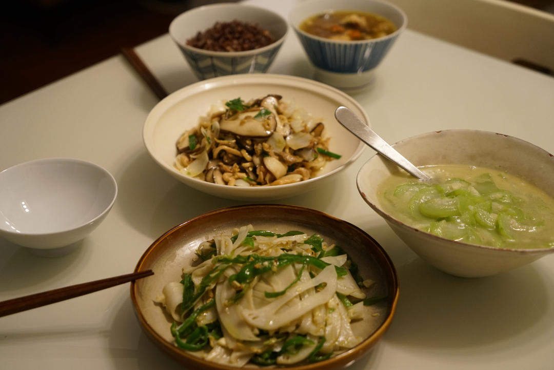 晚餐:白玉丝瓜、辣椒脆藕、百合鸡肉